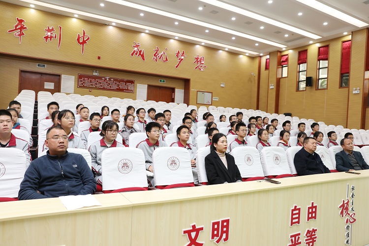 曾伟致辞,代表学校向一直热心公益慈善事业的劲牌公司、湖北省慈善总会、荆州市慈善总会表示衷心的感谢,感谢他们给予荆中学子的大力帮助,并为阳光班班主任严文娟颁发聘书。