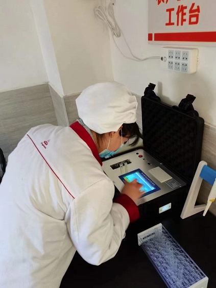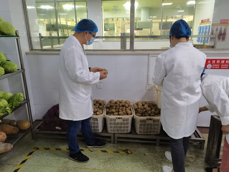 早上8点,检查人员在学校食堂门口集合,在食堂负责人带领下,所有人检查了食堂主食库、副食库、蔬菜储藏处,并查验当天猪肉、牛肉等肉制品的品相,选取蔬菜样品现场进行农药残留检测。