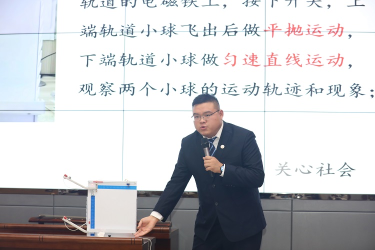 王澳庆(物理)老师的课堂和谐融洽,倍感亲切,教具直观,手段先进,示范设计合理,指导操作规范,他对课堂突发情况的灵活应对,知识的自然过渡、层次分明,赢得了评委老师们的一致认可。