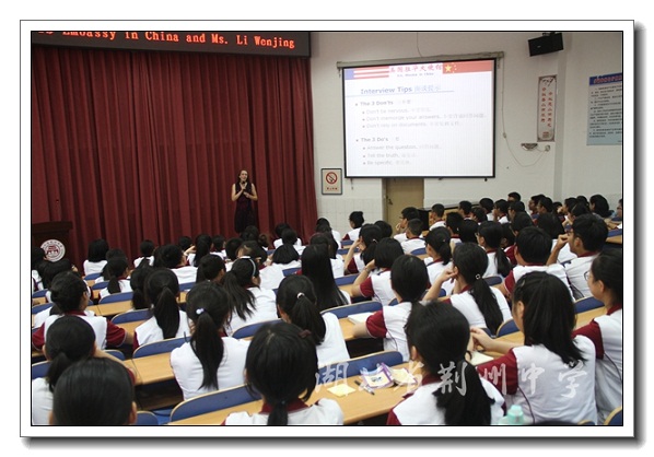 随后,周安娜女士在多媒体教室为我校学生做赴美留学签证讲座。周安娜女士就签证面谈前的准备工作、申请签证流程、签证面谈时的注意事项及人们对于赴美留学签证的一些误解等方面为学生作了详细的讲解。最后,周安娜女士与学生们进行了互动活动,回答了学生所关心的赴美留学及签证申请方面的问题,整个会场气氛轻松、活泼、友好。