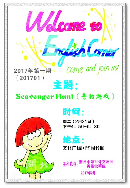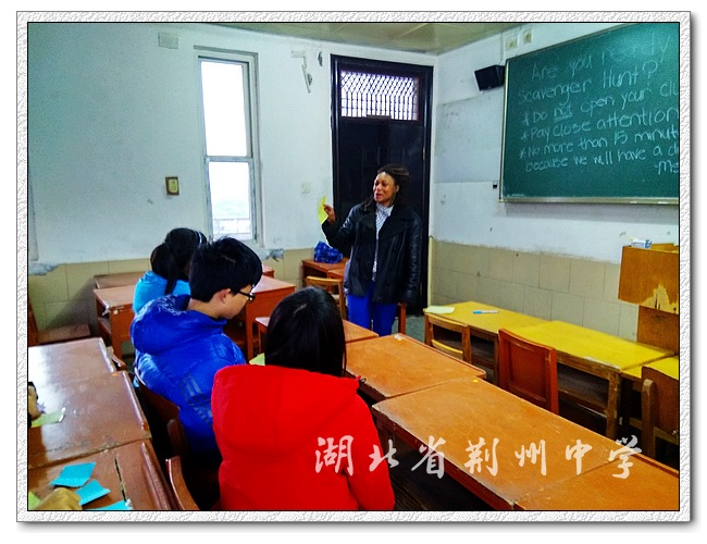 本次活动,在学校美籍外教Linda和对外交流处教师周舟的精心设计下,以“Scavenger Hunt(寻物游戏)”为主题,旨在激发学生的好奇心和想象力。周舟老师简单地介绍了活动规则,在外教老师的热情大方的鼓励引导下,学员们进行激烈的分组讨论和反馈汇报,整个活动和谐、欢乐。贴近中学生日常生活设计的活动任务,不仅有趣而且很有现实意义,勇于表达自我意见的荆中学子不但有话说、愿意说,现在更能大胆说。有趣的英语活动,有益学生掌握英语的学习技巧,提升英语的运用能力,了解英美的历史文化。
