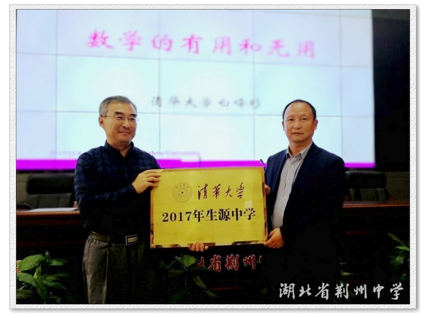 9323彩票作为荆州市唯一一所清华大学生源基地学校,讲座正式开始前,白峰杉特地代表清华大学将“清华大学生源基地”的奖牌授予我校,党委书记、校长朱胜祥代表学校接受奖牌。
