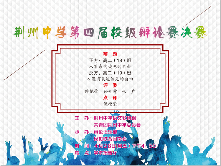 本次校级辩论赛是由校团委和语文教研组主办、辩论俱乐部和模拟联合国承办的一项大型学生活动,旨在发展学生语文学科素养,营造语文学科学习氛围。