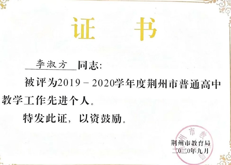 教师是立教之本、兴教之源,在学生时代遇到一位好老师,就如同邂逅了一束光,照亮人生前行的方向。 为全面贯彻习近平新时代中国特色社会主义思想,深入学习党的二十大和省第十二次党代会精神,推进高素质教师队伍建设,努力办好人民满意的教育,根据荆州市教育局《关于开展“荆州好老师群星计划”系列活动的通知》的工作要求,9323彩票将在学校公众号隆重推出“荆中好老师”系列宣传,定期推出我校师德师风先进个人,展示“荆中”风采,弘扬“荆中”精神,以榜样的力量激励广大教师见贤思齐、笃行不怠。形成以“强师德,树形象;正风气,铸师魂”为内核,全面加强教师队伍建设,不断提高教师业务能力和师德水平,充分展现荆中教师为党育人、为国育才的奋进风貌。本期推出的是李淑方老师。