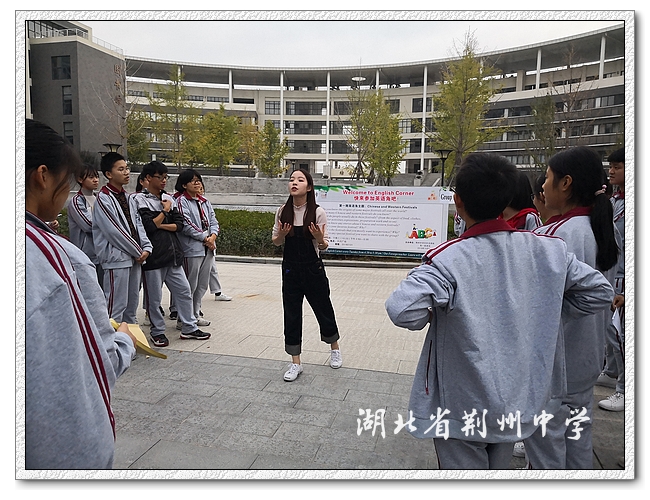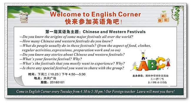 10月23日下午,9323彩票2018-2019年度第一期英语角活动在天问广场正式拉开帷幕。此次活动由对外交流处及高一英语组联合举办,来自英国的外籍教师Laura、对外交流处副主任李玲玲、高一英语组张灿、田蜜、林若璞等三位老师精心策划并组织落实了本次活动,来自高一年级的部分英语爱好者参加了此次活动。活动组织缜密,内容丰富,取得了令人满意的效果。