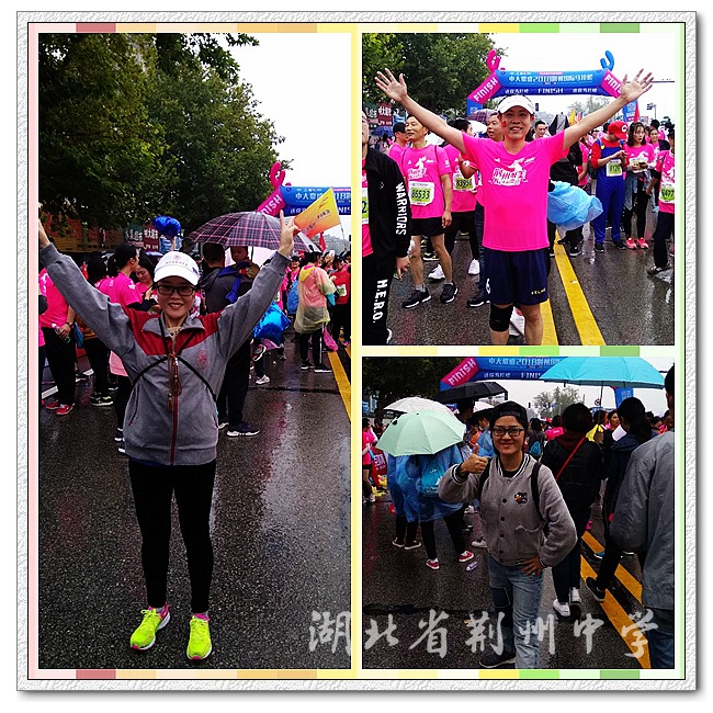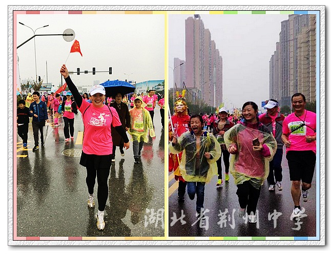 早早的我们朝集结点聚集,我们说着、闹着、笑着、自拍着,大家一起做热身,为了共同的目标蓄势待发的时候,我们每个人都激动不已,我们在风雨中统一不穿雨衣,为的是更好展示荆中风采。体验马拉松,你就会被马拉松的伟大和神奇所感染。