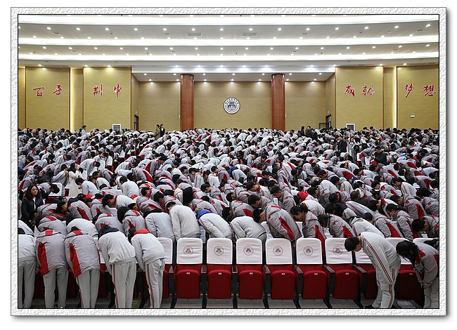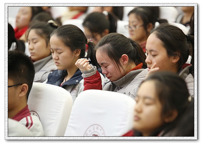 中间的互动环节将整个演讲推向高潮。舒缓的音乐伴着杨教授深情而激昂的演说,同学们重拾这十几年来学习生活的点点滴滴。父母的恩情不能忘,老师的陪伴不可负。当全体同学向着自己的班主任90度深深鞠躬的时候,当他们争先恐后跑去拥抱自己老师的时候,当全体师生泪洒会场的时候,我们所有的人都接受了一次心灵的洗礼。