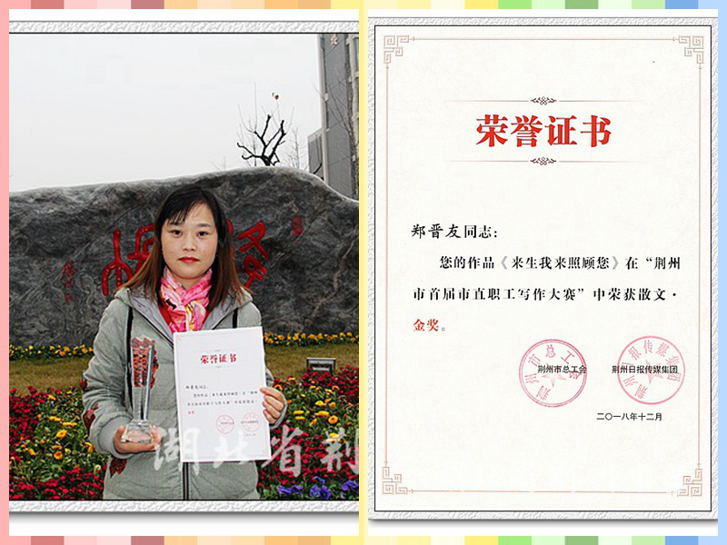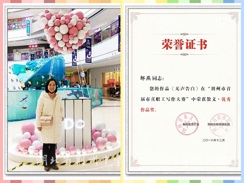 我校郑晋友老师的参赛作品《来生,让我来照顾您!》荣获散文金奖,吴晓丽老师的参赛作品《欣闻三国事 每欲到荆州》荣获散文银奖,刘红民市老师的参赛作品《流光里的巷子》、杨锦瑛老师的参赛作品《紫藤何处》、周贤老师的参赛作品《那些花儿》、邹燕老师的参赛作品《无声告白》荣获散文优秀作品奖,我校获得本次活动的优秀组织奖。