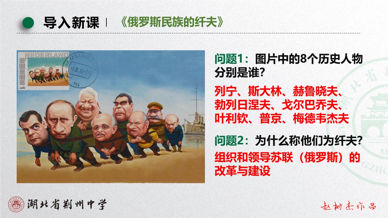 赵树杰以邮票《俄罗斯民族的纤夫》导入,新颖独特。并从近几年新课标卷高考真题为切入点,归纳出高考考点,进而拓展出考点的核心知识。接着依托丰富的史料,就高考重难点问题进行深入探究,并从社会主义建设理论的创新角度进行了提炼和升华。
