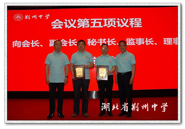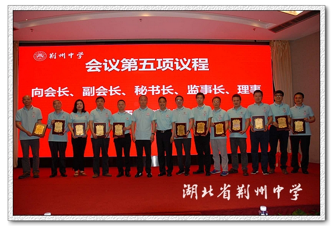 朱胜祥感谢深圳校友会向母校捐赠“求索”雕塑 ,这座即将屹立在天问广场中央的大型雕塑将激励荆中学子不忘初心,上下求索。向深圳校友会会长、副会长、理事、秘书长、监事长颁发聘书。