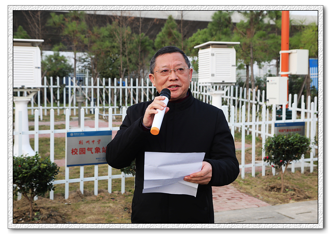 市气象局局长艾劲松在揭牌后讲话。他向同学们介绍了气象站筹备建设的许多细节,让同学了解到了气象站的来之不易。作为一名荆中校友,他希望学弟学妹们珍惜这个窗口,积极参加气象观测小组,学习气象相关知识,未来也能报考气象学专业,成为他的同行。