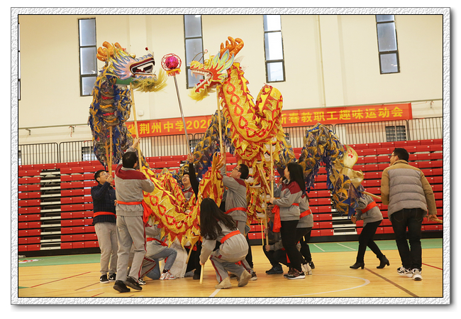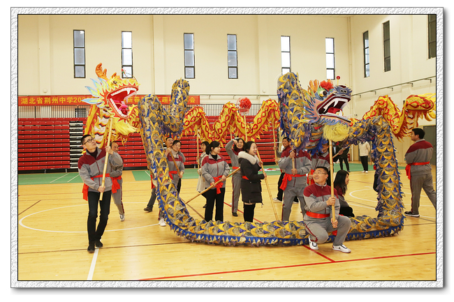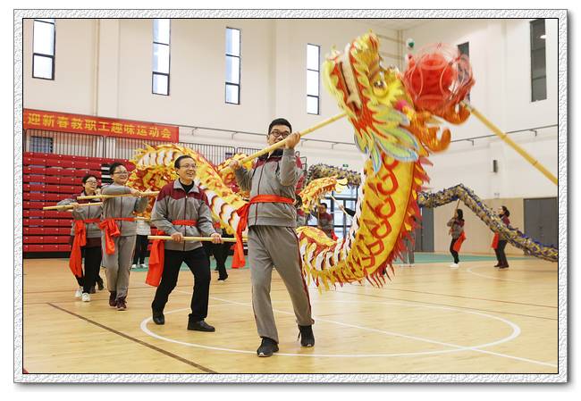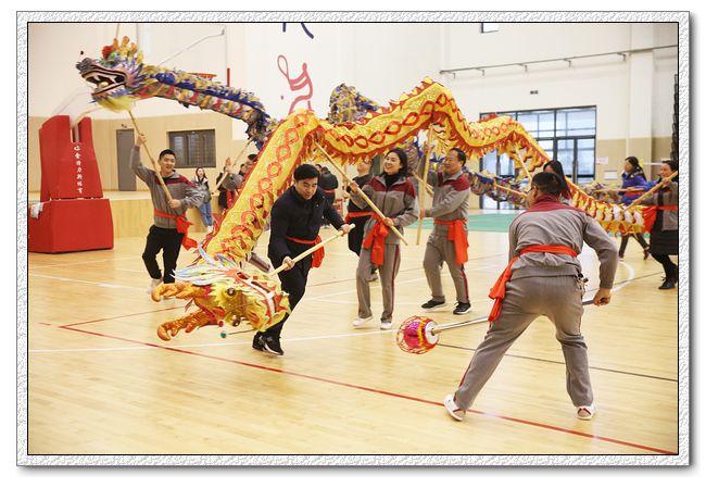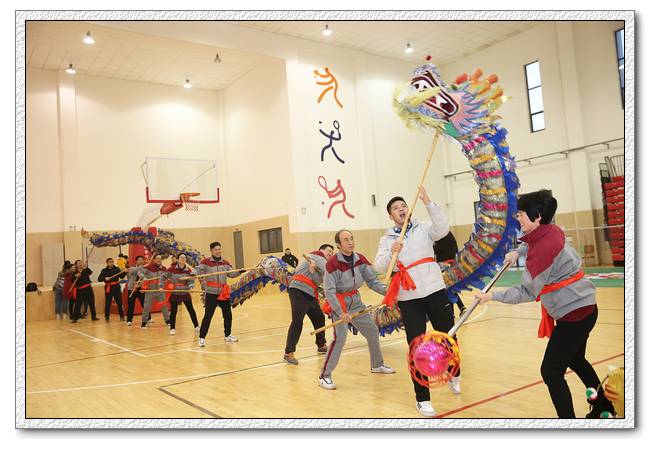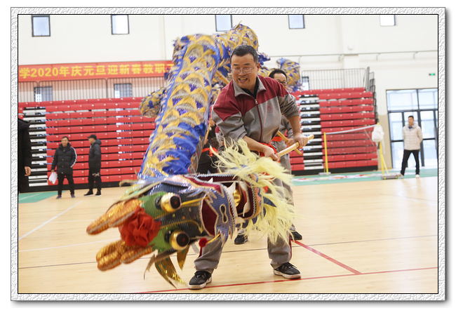 在热闹的锣鼓声中,语文队、数学队、英语队、物理信息队、化学队、生物艺术队、政史地队、行政综合队八支舞龙队进行了精彩的舞龙表演,每队两条龙,一条金色一条紫色,气宇非凡,上下翻腾,左右飞舞,迸发着激情与活力,呈现出一片生机勃勃、锐意进取的浓厚氛围,辞旧迎新龙灯舞出浓浓年味,喜庆和吉祥洋溢着整个校园。