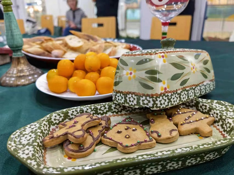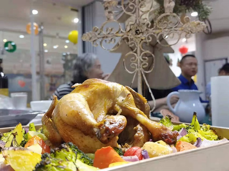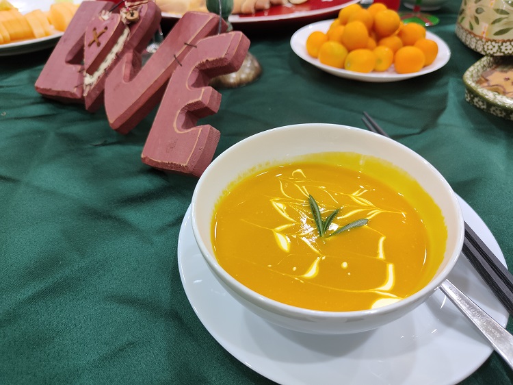 香草鸡,披萨,果香热红酒,奶油南瓜浓汤,水果沙拉,紫米蛋糕,姜饼人糖霜饼干等。